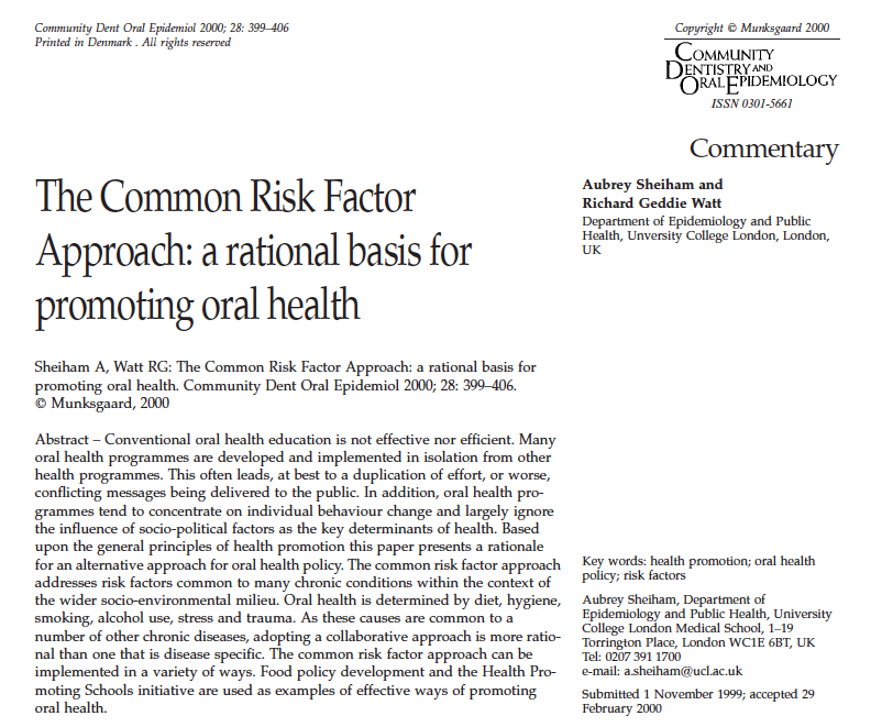 Professor Watt also co-chairs the recently established Lancet Commission on Oral Health. Based in UCL Institute ofEpidemiology and Health Care a particularstrength of the programme is the focus onexploring the application of public healthphilosophy to dental public health issues.